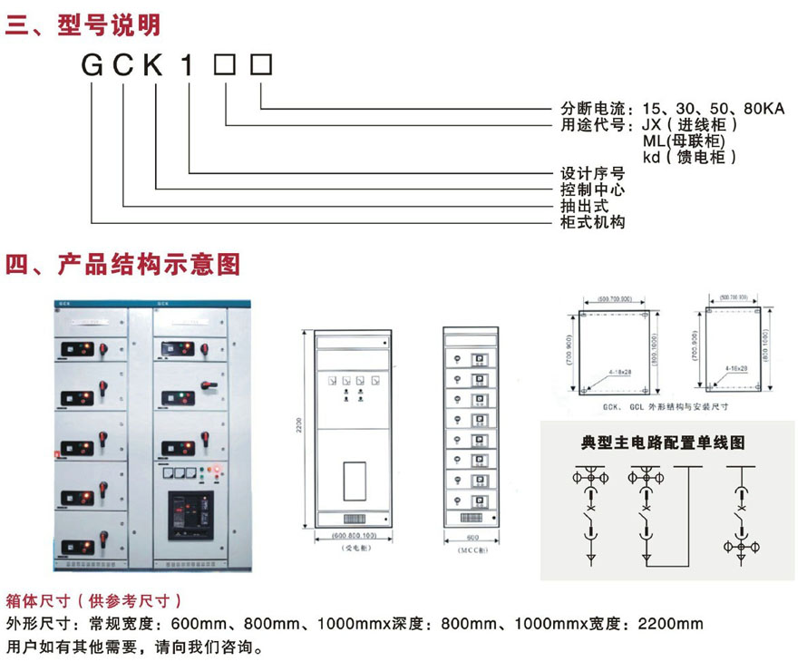 >GCK開關柜符合IEC60439-1《低壓成套開關設備和控制設備》、G B7251.1-2005《低壓成套開關設備和控制設備》、GB/T 14048.1-2006《低壓開關設備和控制設備總則》等標準。且具有分斷能力高、動熱穩定性好,結構先進合理,電氣