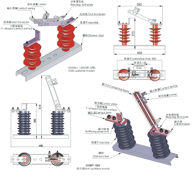 GW9系列戶外高壓隔離開關(guān)(以下簡稱為開關(guān))適用于10KV高壓輸配電線路上,用于切斷和閉合無負(fù)載有電壓的單相或三相電路。