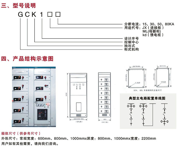 >本公司生產(chǎn)的抽出式低壓開關(guān)柜GCK系列低壓開關(guān)柜由動(dòng)力配電中心(PC)柜和電動(dòng)機(jī)控制中心(MCC)兩部分組成。該裝置適用于交流50(60)Hz、額定工作電壓小于等于660V、額定電流4000A及以下的控配電系統(tǒng),作為動(dòng)力配電、電動(dòng)機(jī)控制及照明等配電設(shè)備。